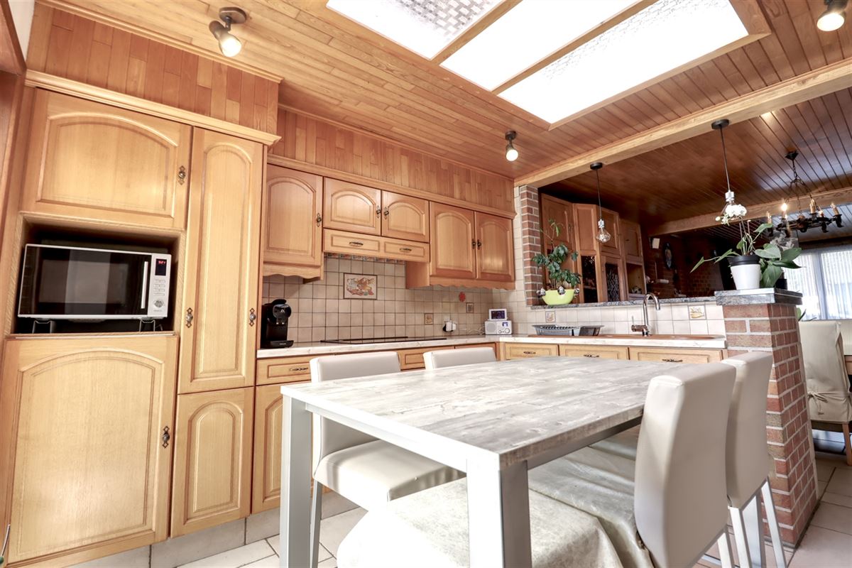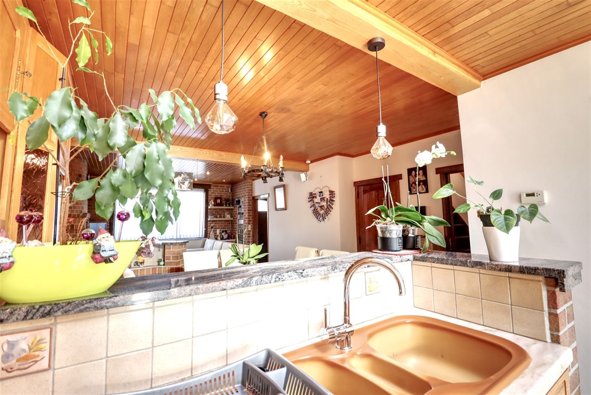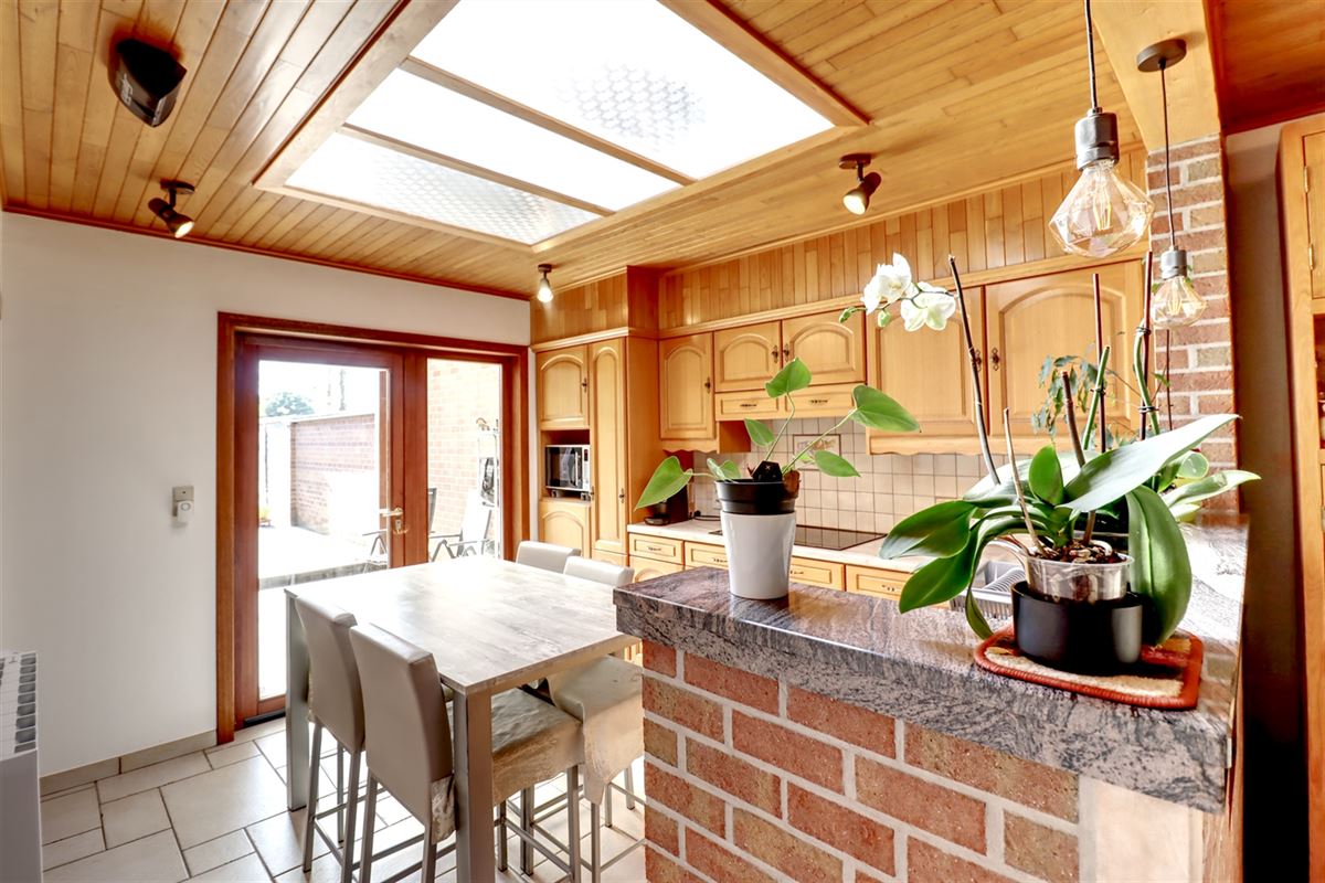 De inkom voorziet in een praktische berging waar dagelijkse spullen vlot hun weg vinden. De leefruimte kreeg grootse afmetingen, zithoek, eethoek en keuken treffen er elkaar. De keuken geniet van een fraaie inrichting en heeft voldoende ruimte voor een extra eettafel.