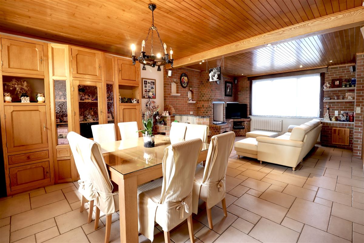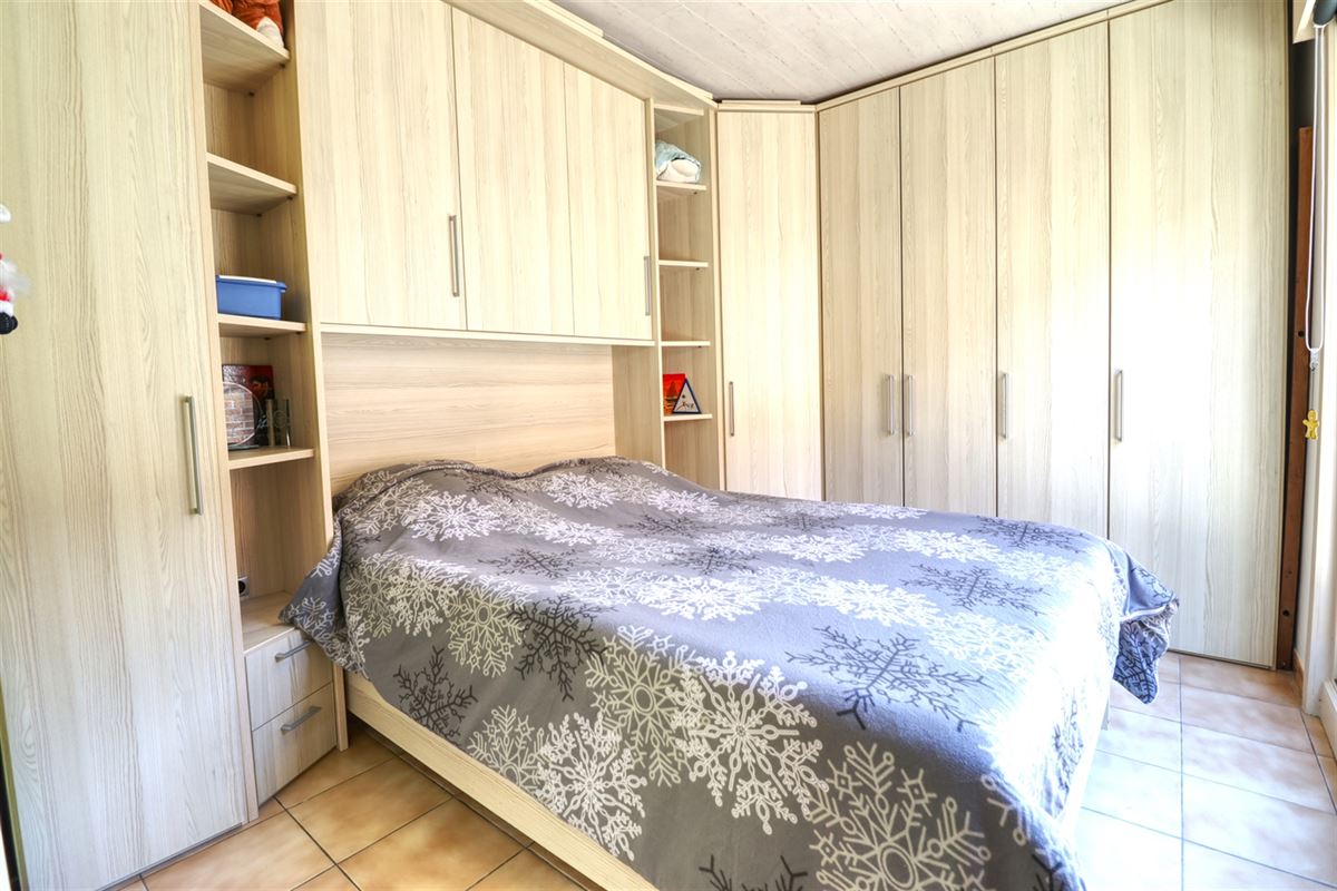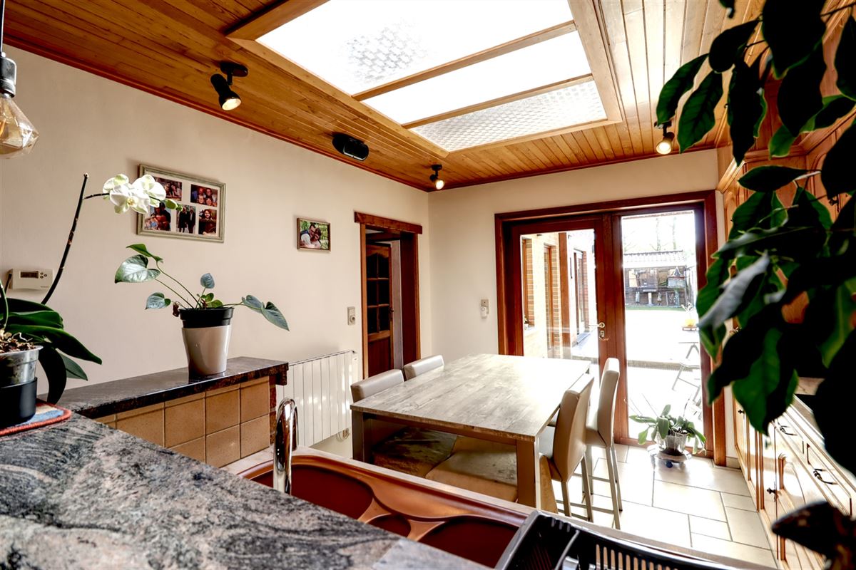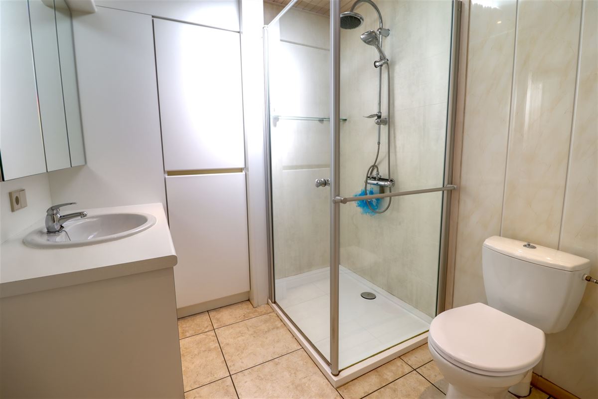 De inkom voorziet in een praktische berging waar dagelijkse spullen vlot hun weg vinden. De leefruimte kreeg grootse afmetingen, zithoek, eethoek en keuken treffen er elkaar. De keuken geniet van een fraaie inrichting en heeft voldoende ruimte voor een extra eettafel.