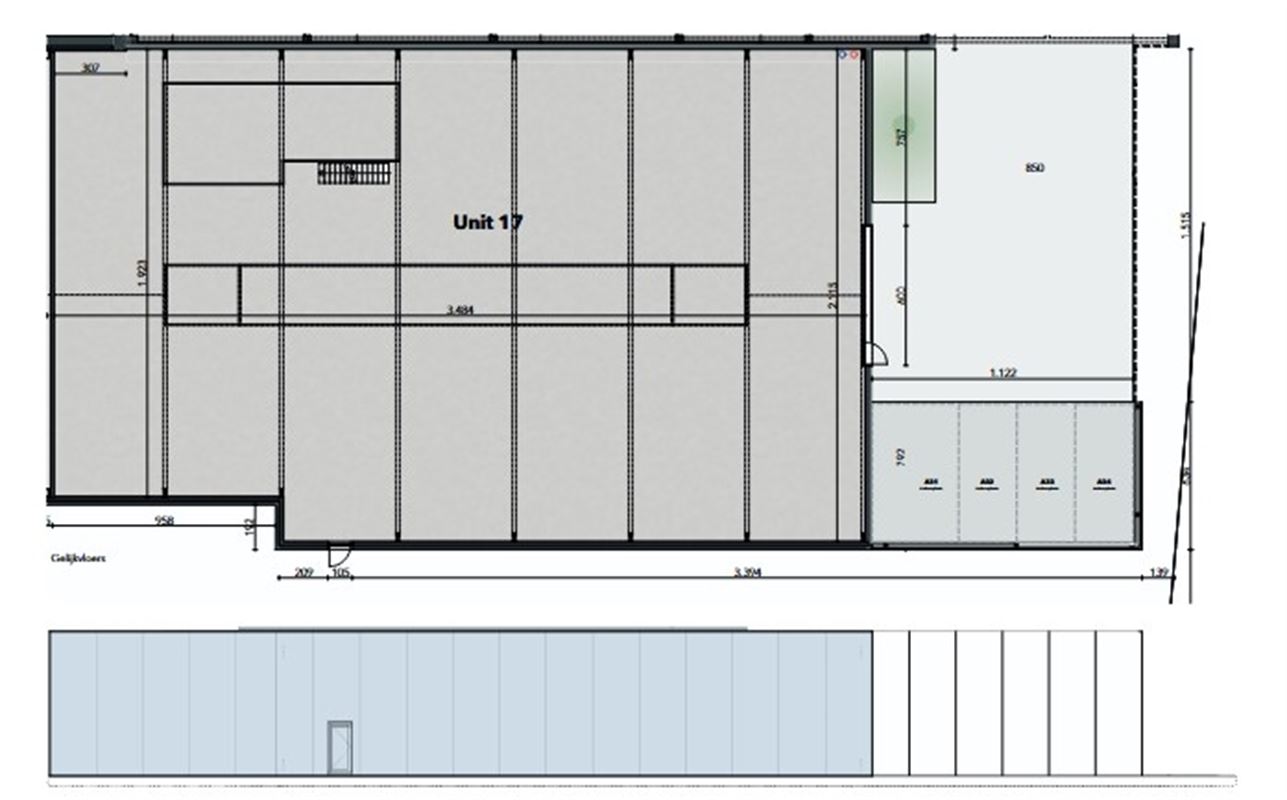 De loods heeft een breedte van 21m en een diepte van 34m en beschikt over een inpandig kantoor en 8 parkeerplaatsen. het gebouw heeft een vlotte bereikbaarheid en beschikt over een functionele laad -en loszone en een grote sectionale toegangspoort.