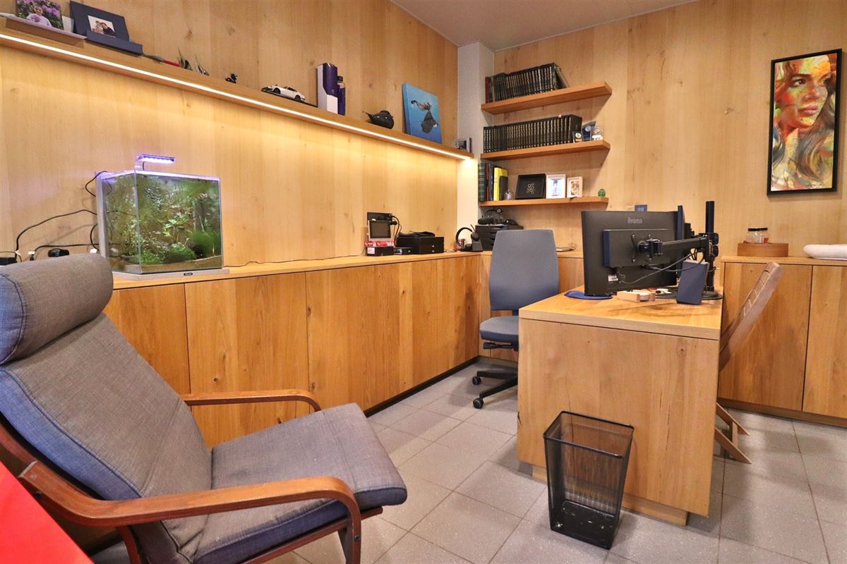 Een ruime inkomhal heet ons hartelijk welkom, er is een apart bureau, een zalige woonkamer en een comfortabele keuken met tuinzicht.