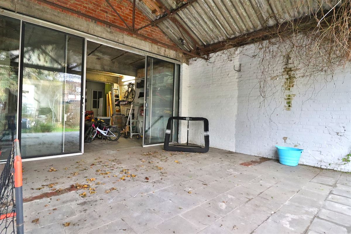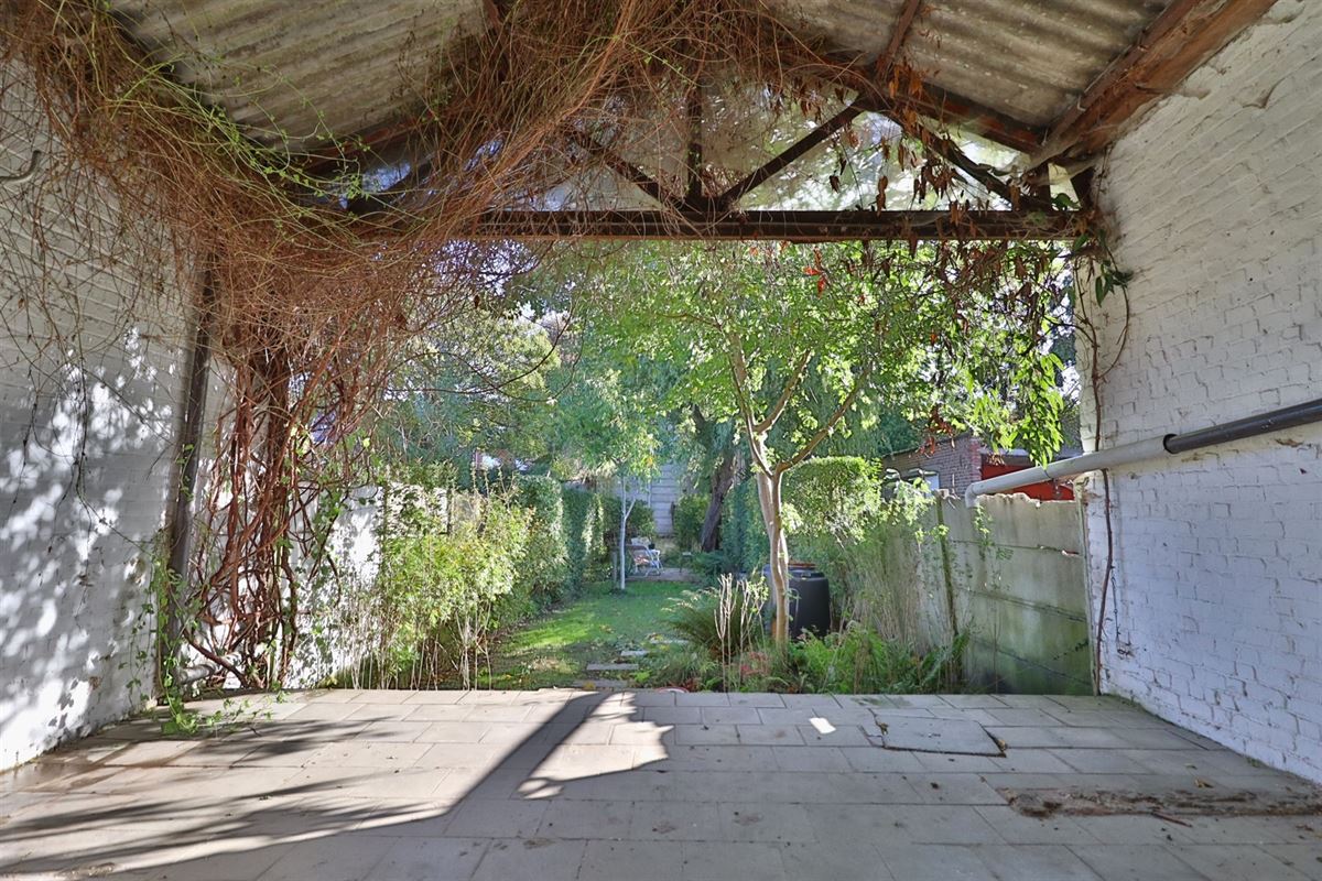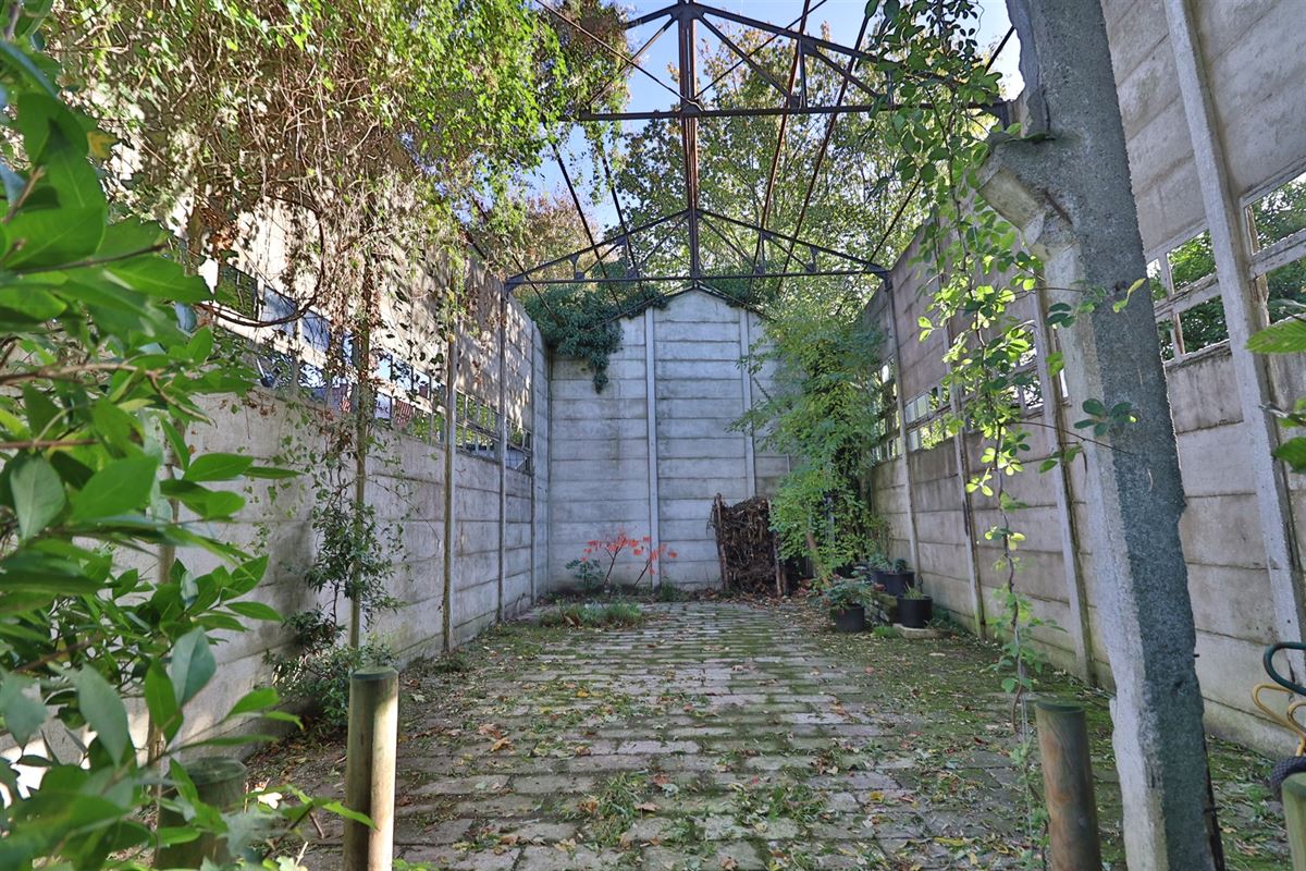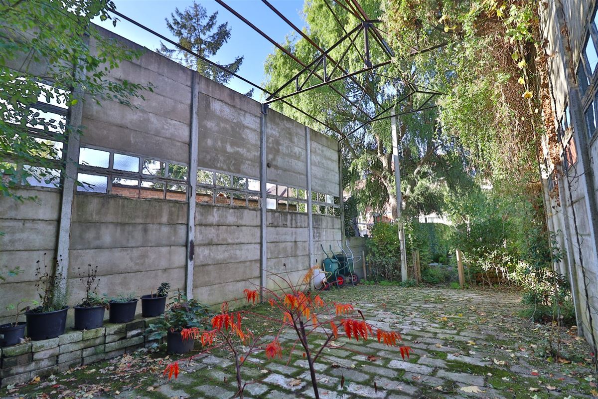 De tuin is een zalig groene oase midden de stad met achteraan de casco constructie van een oudere loods die eventueel weer kan worden benut.