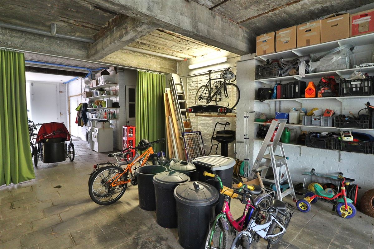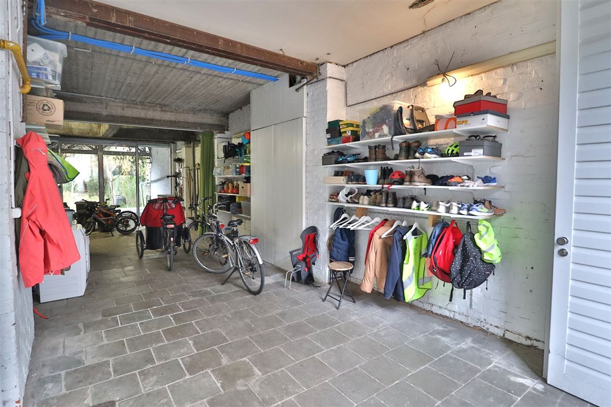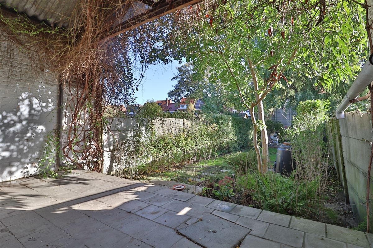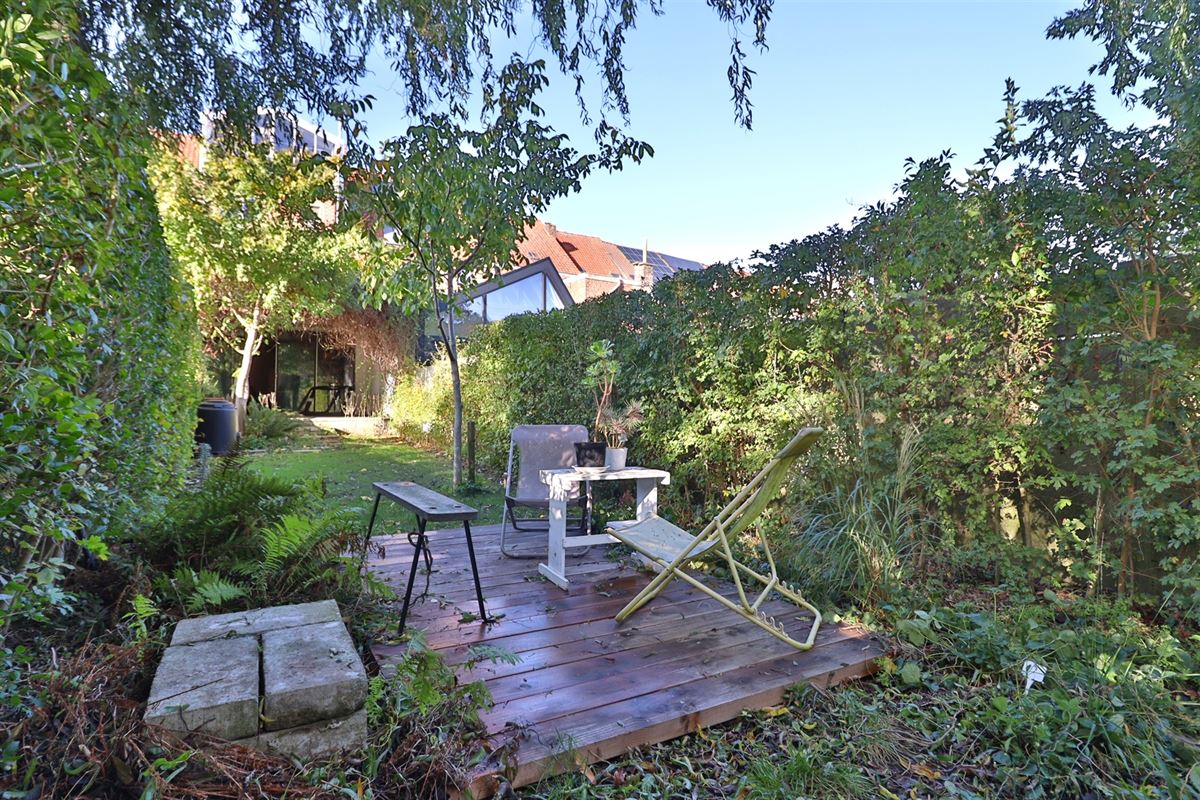 De tuin is een zalig groene oase midden de stad met achteraan de casco constructie van een oudere loods die eventueel weer kan worden benut.
