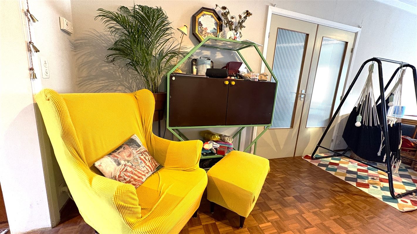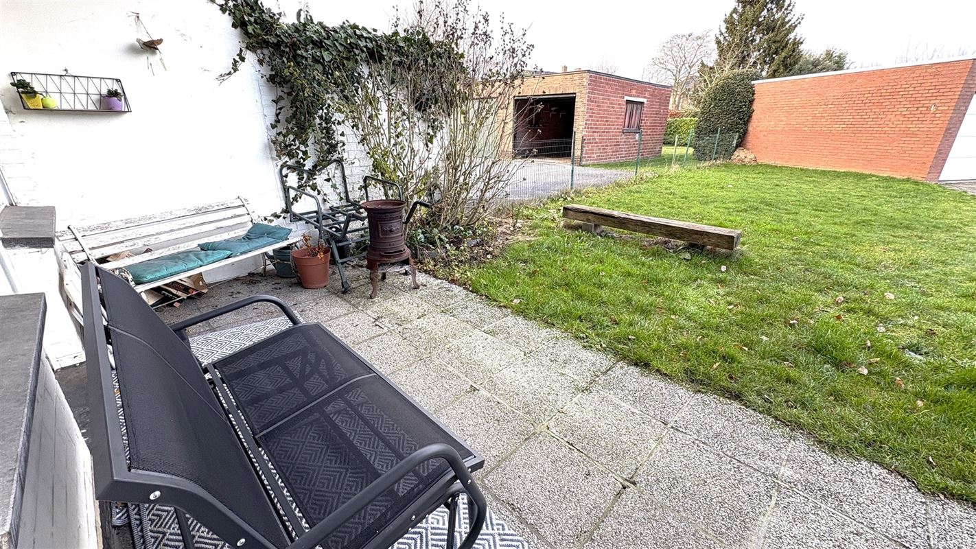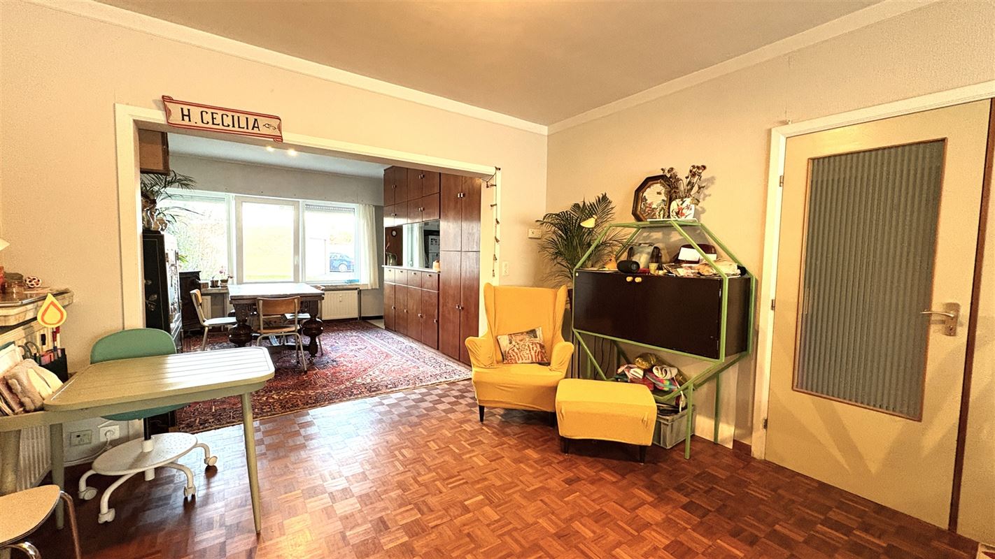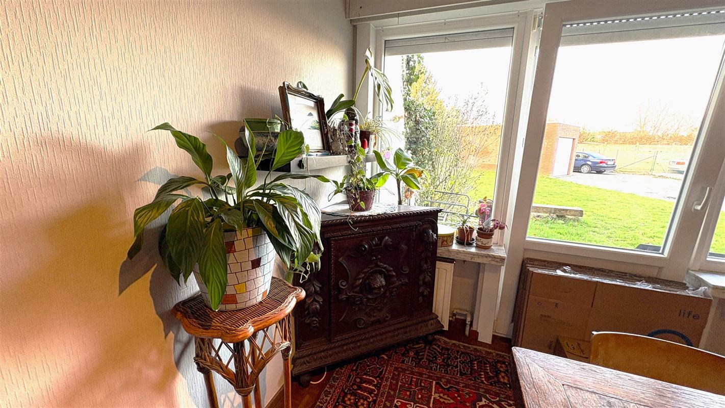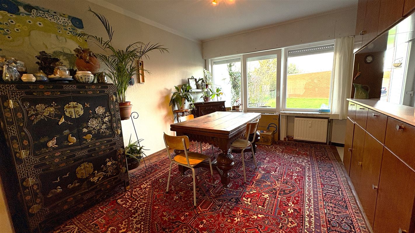 Inkomhal met toilet, ruime leefruimte met tuinzicht en netjes geïntegreerde keukenhoek.
