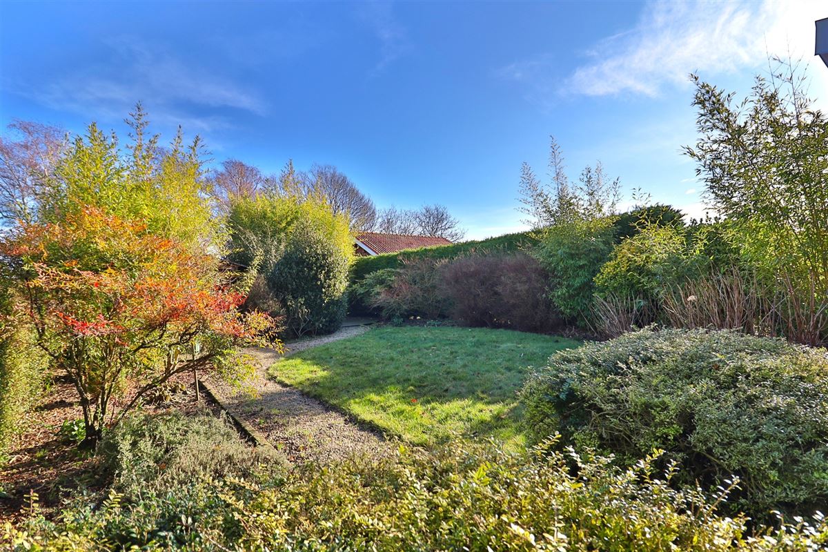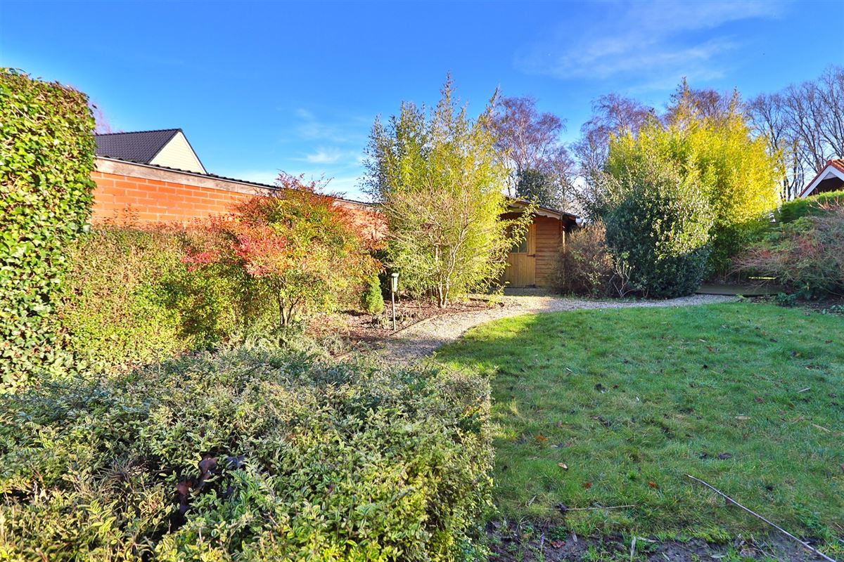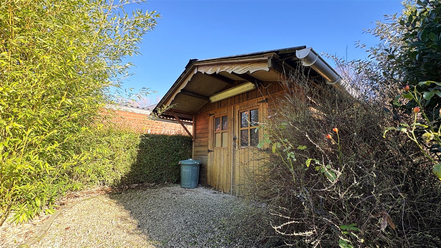 Achteraan pakt de tuin uit met een groene invulling, een gezellig terras en een degelijk tuinhuis vullen het geheel aan.