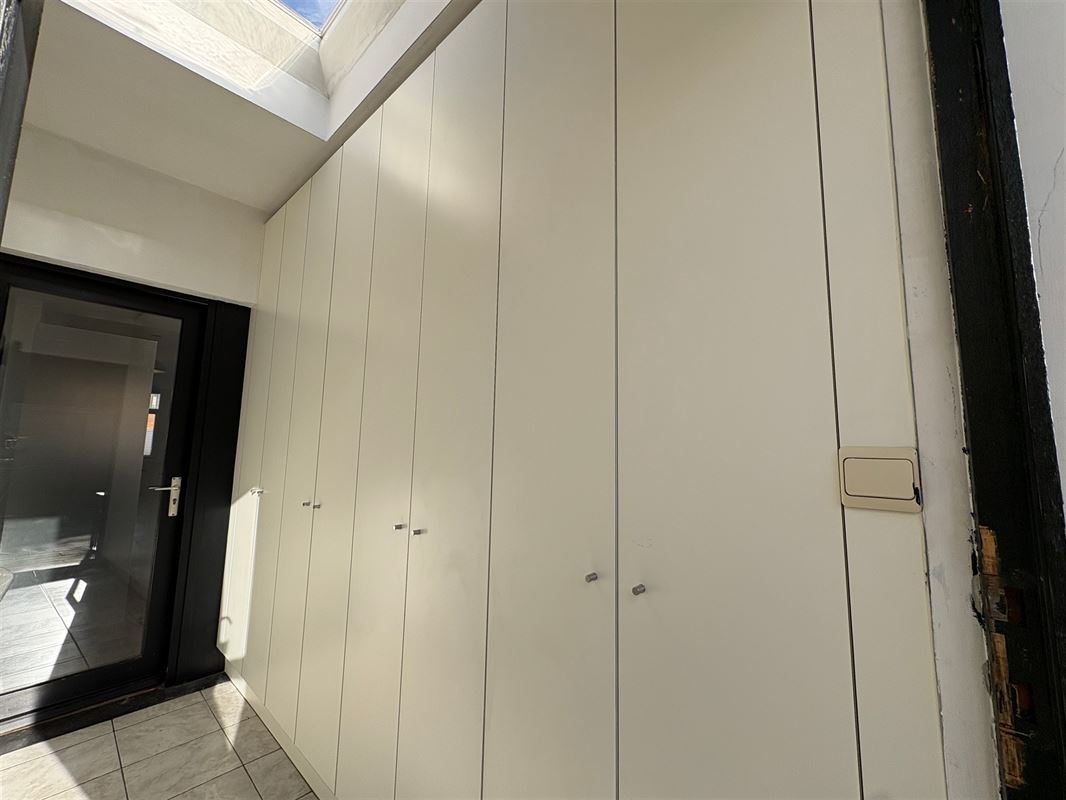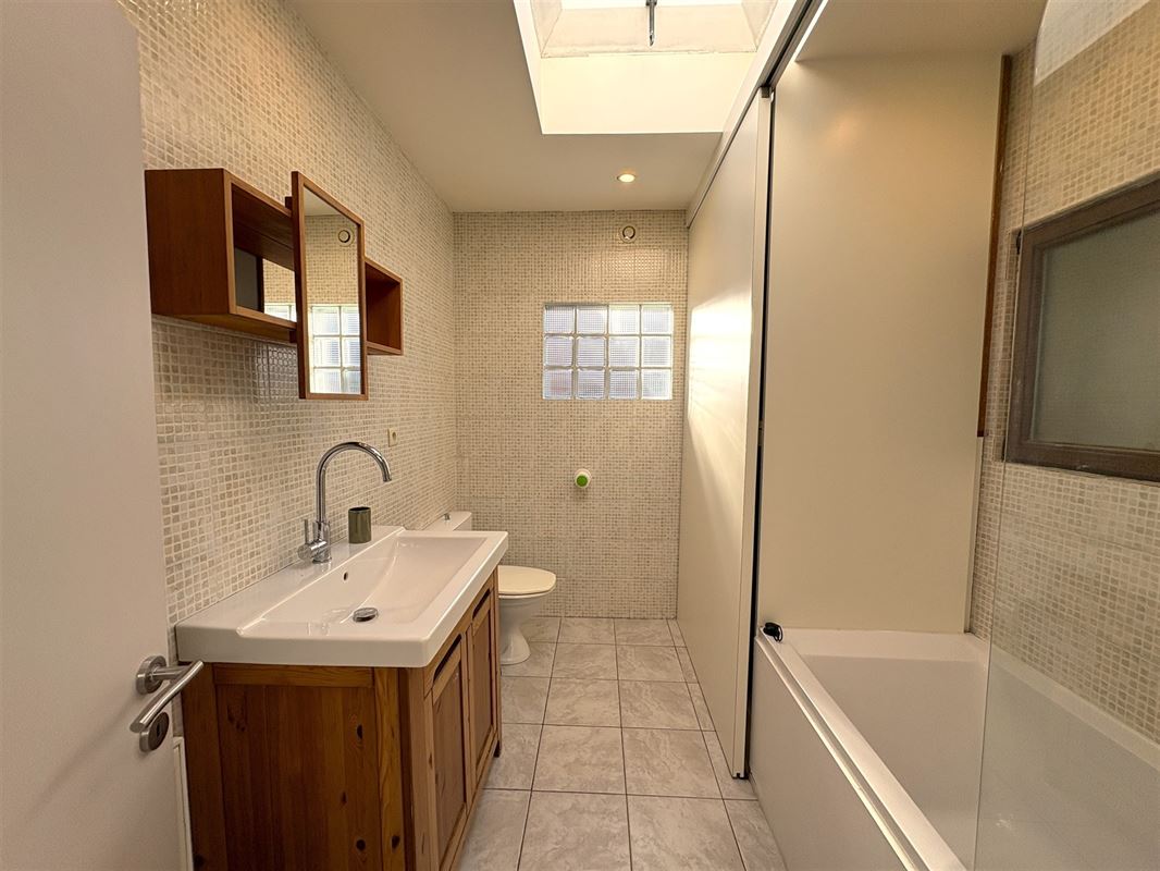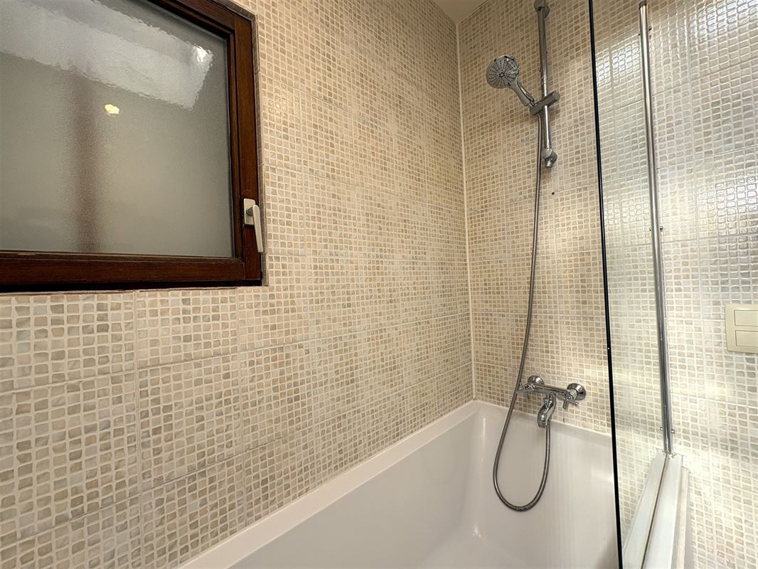 Er is een nette badkamer met grote bergkast waar de wasmachine vlot zijn plaats vindt.