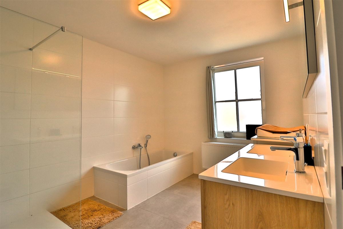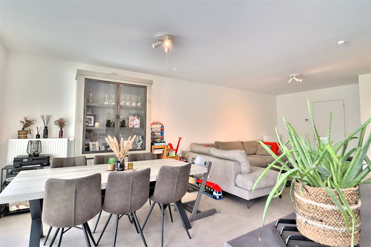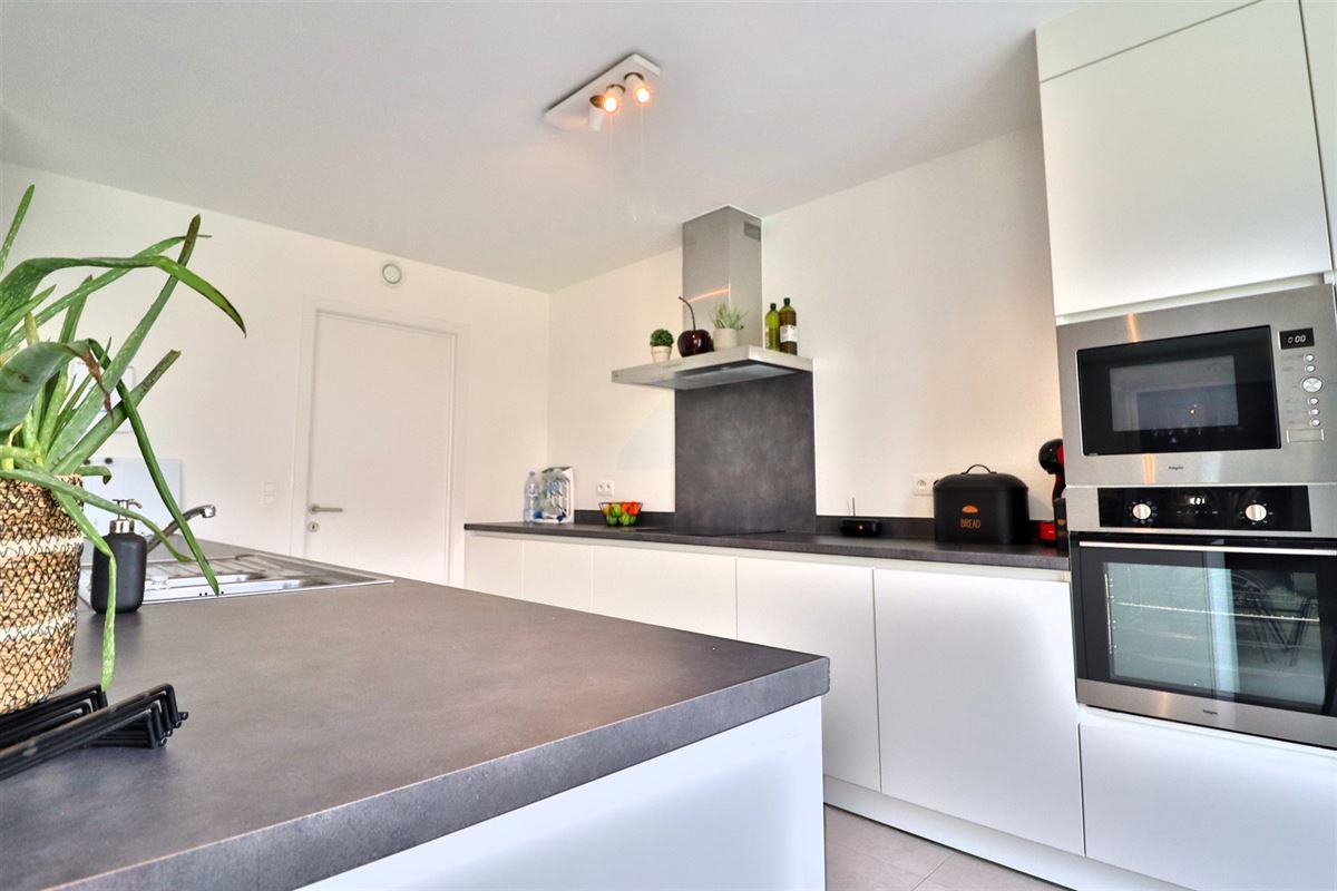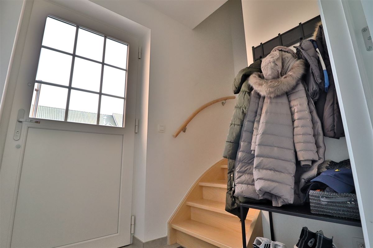 De voortuin met groene invulling brengt ons naar de inkom. Er is een apart toilet en een doorsteek naar de extra large leefruimte waar tuincontact centraal staat.